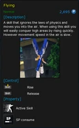 When Fly is activated, the user sprouts mechanical wings from his/her back and will be able to float around the battlefield for a short period of time, depending on the amout of SP the player has. This skill allows the player to achieve heights that would be impossible for other players without Fly. While using Fly, the user may be easy to spot by other players, especially in open battlefields. Also, even though the player is able to use ranged weapons while using this skill, the player is otherwise completely defenseless and vulnerable to attacks.